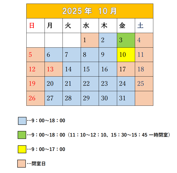 開室時間・開室日ともに通常とは異なりますので、来室前にご確認ください。