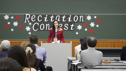 大妻女子大学英語英文学科では、英語のスピーキング能力・発音向上と、人前でのプレゼンテーション力の向上という二つの目標を兼ねて、毎年12月のクリスマスの時期に、1年生を対象としたレシテーション・コンテストを開催しています。